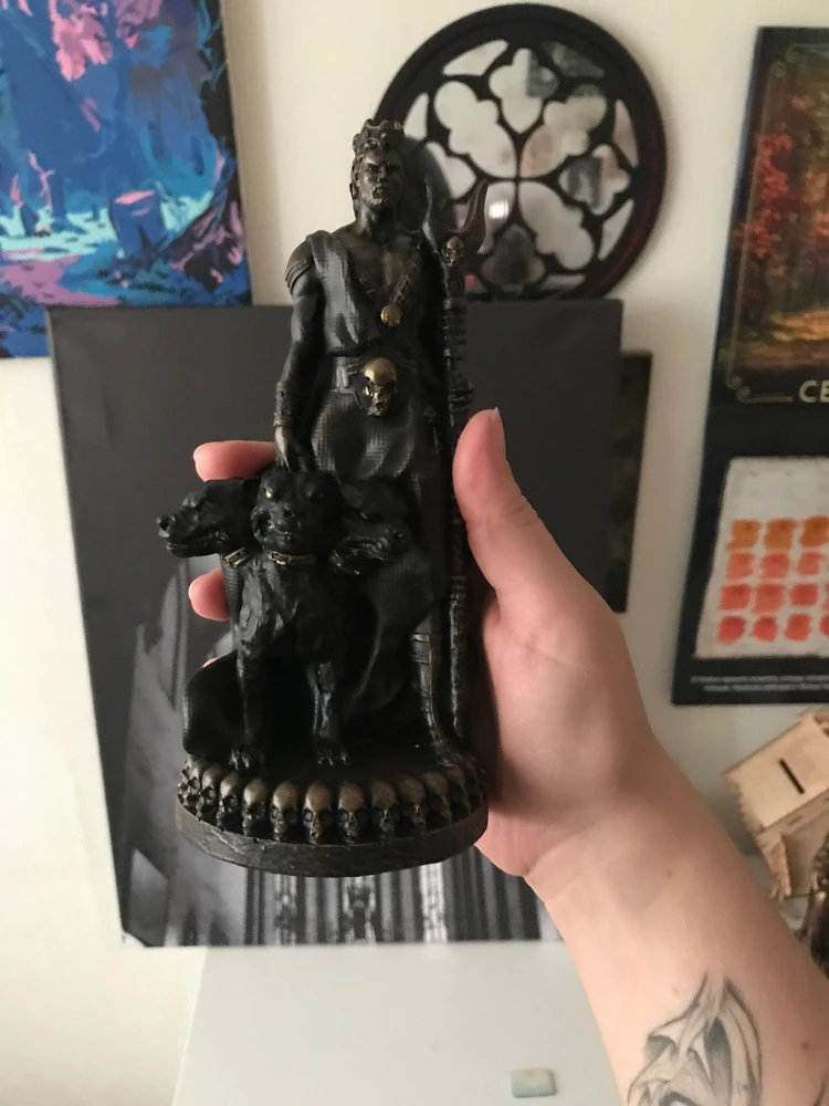 Авторская ручная роспись: Мастер индивидуально расписывает каждую статуэтку. Глубокие, темные тона с мерцающими металлическими акцентами в росписи передают таинственность, власть над тьмой и сияние подземных сокровищ, делая ваш артефакт уникальным.