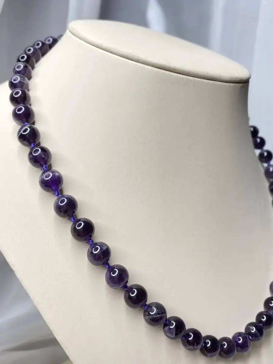 Аметист является одним из самых популярных полудрагоценных камней для духовных украшений не только из-за его мистического темно-фиолетового цвета, но и из-за ряда других успокаивающих и исцеляющих способностей. Этот камень рекомендуется для снятия стресса, укрепляет эндокринную и нервную системы, повышает активность правого полушария головного мозга, нормализует работу эпифиза и гипофиза, очищает кровь и улучшает кровообращение. Аметист балансирует обмен веществ, так что организм может сжигать калории более эффективно. Он также балансирует гормоны, что улучшает потерю веса. Еще одной из ведущих преимуществ аметиста — детоксикация. Он способствует очищению организма. Успокаивающая энергия аметиста усмиряет боль и помогает уменьшить две основные причины головной боли: стресс и усталость.