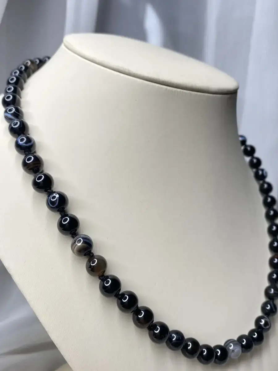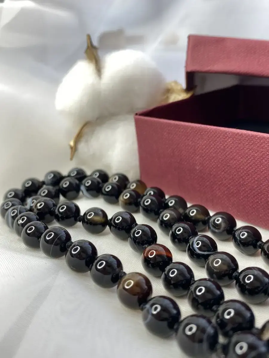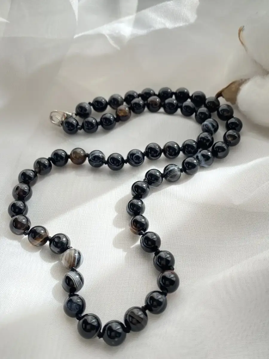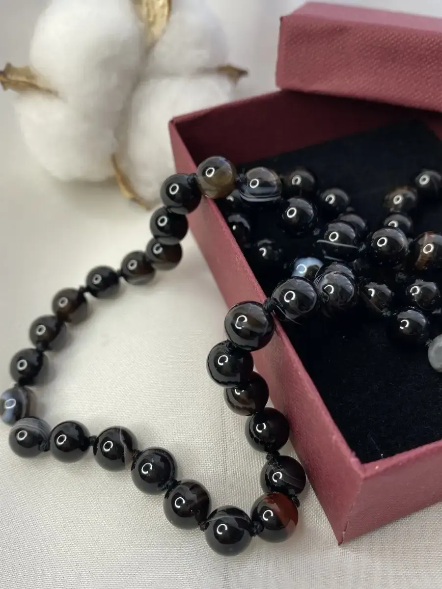 Индийские мудрецы считают, что камень чёрный агат имеет живую душу. Магические свойства чёрного агата защищают владельца ожерелья от плохого влияния. Бездонная поверхность камня способна успокоить во время приступов ярости. Считается, что чёрный агат помогает увеличить длительность жизни. Особенно он подходит трудящимся на руководящих должностях и преподающим в учебных заведениях. Данный камень награждает человека лидерскими качествами и успокаивает нервы. Счастливые обладатели камня могут использовать его и в лечебных целях. Он эффективно справляется со следующими недугами: нервные заболевания, депрессия, бессонница; тахикардия, аритмия; воспаления и боль; детские страхи и болезни; слабый иммунитет; проблемы с суставами; ожирение и анорексия.