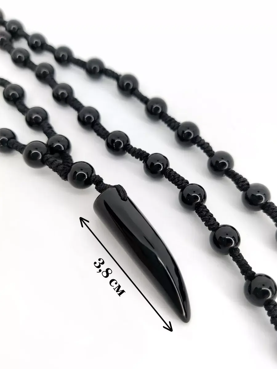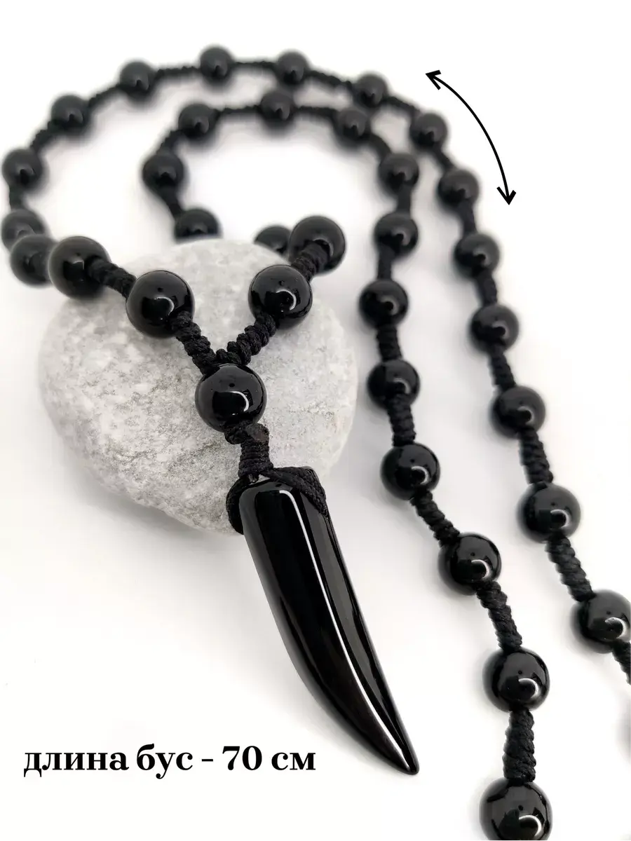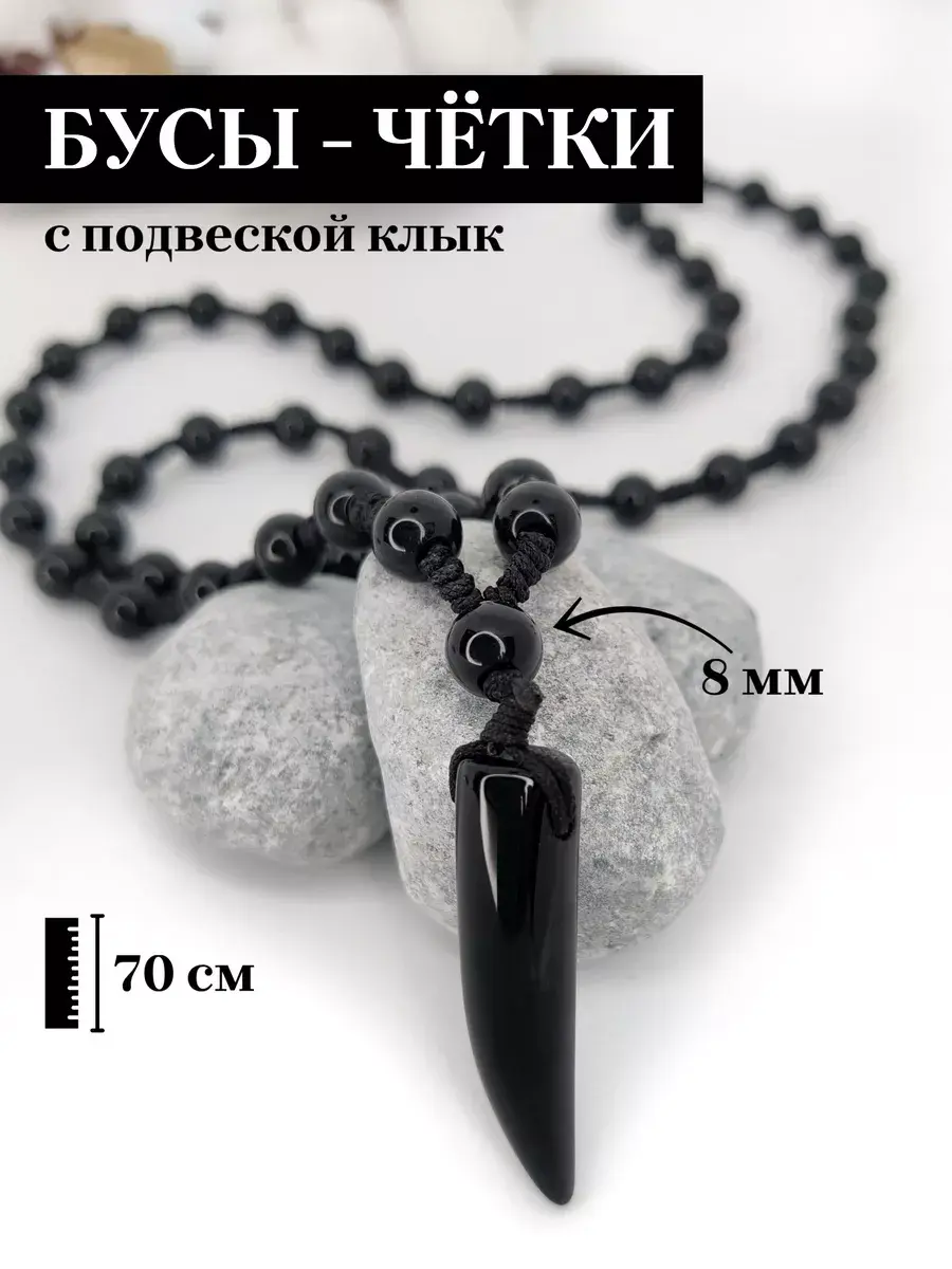 Ожерелье-чётки с имитацией черного агата и подвеской Клык - эффектный уникальный и символичный подарок для мужчин и женщин в красивой ПОДАРОЧНОЙ УПАКОВКЕ!