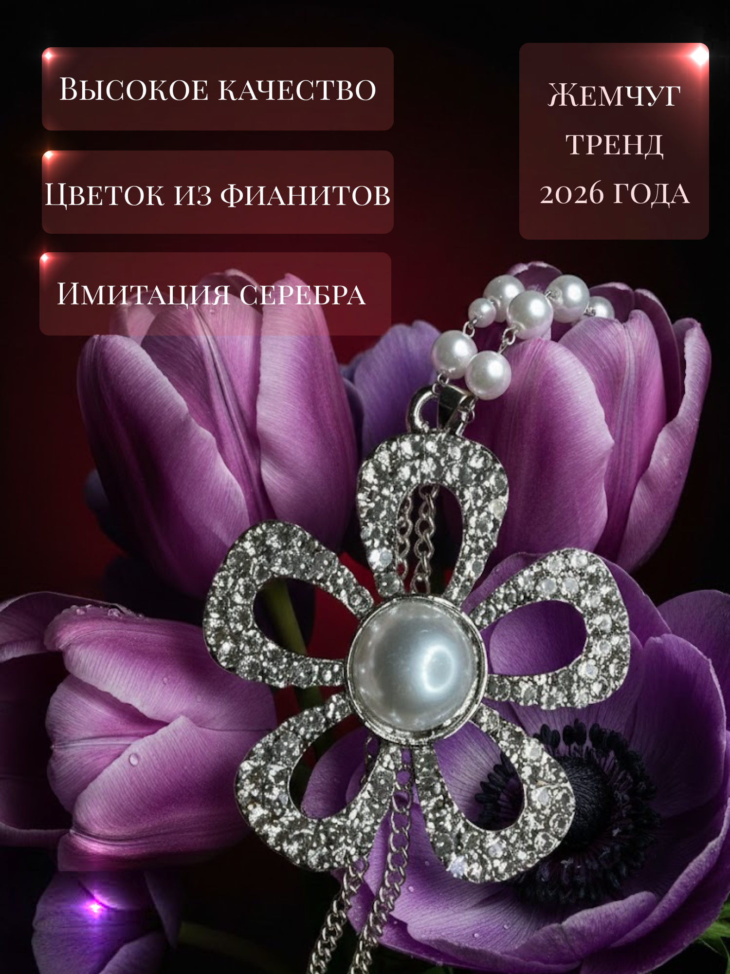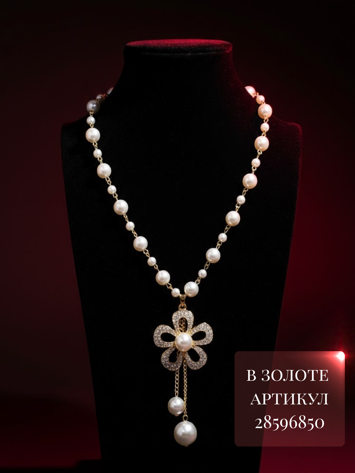 Это колье — гармоничный союз двух вечных символов женственности: безупречного жемчуга и изящного цветка. Длинная нить россыпи бусин и центральный цветочный акцент создают украшение, которое говорит о тонком вкусе, внутренней гармонии и изысканности своей хозяйки.