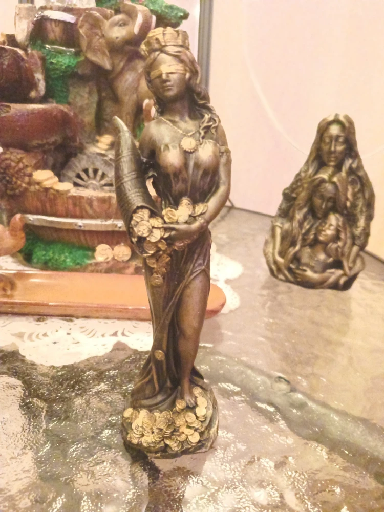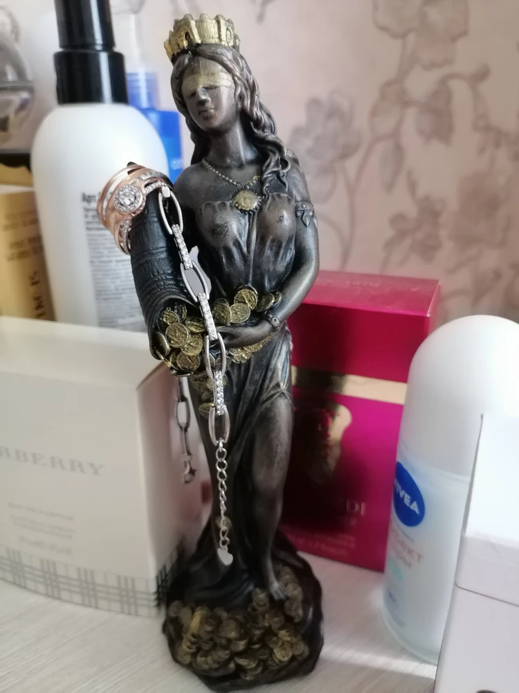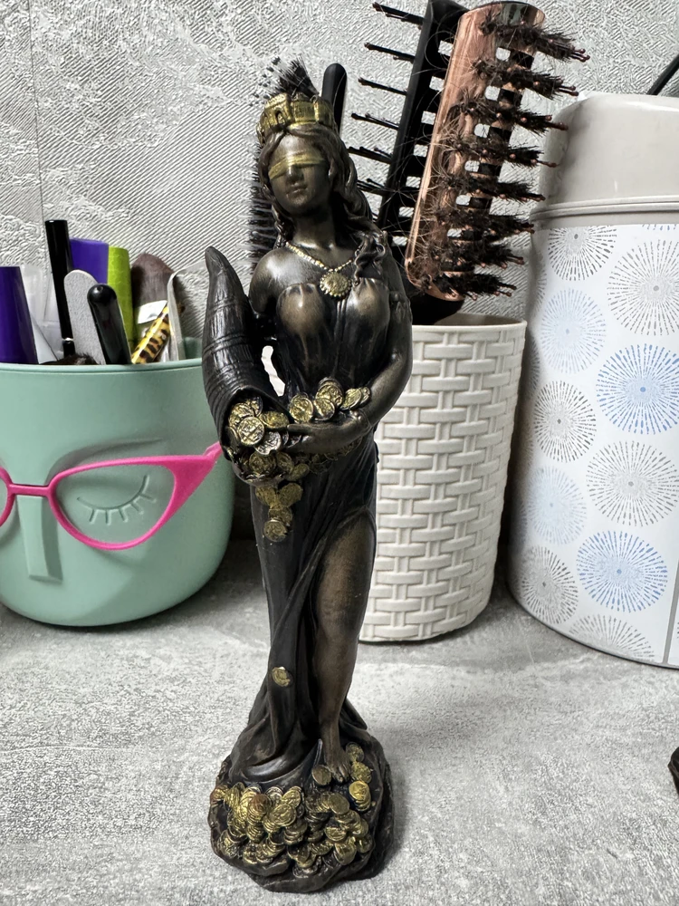 Канонический символизм: Статуэтка высотой 18 см точно передает главный атрибут богини – полный даров рог изобилия (cornucopia), а также часто изображается с рулем судьбы или шаром.