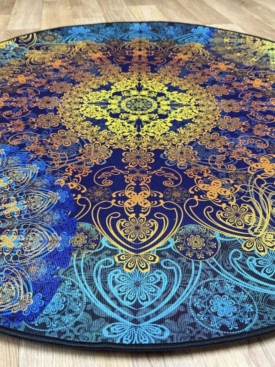В данном случае представлен элегантный нескользящий ковер на пол (и на стену) круглой формы размерами 120х120 см (1.2х1.2 м) из полиэстера под названием "Геометрия Вечности". Ковры такого типа отлично имитируют элитные дорогостоящие аналоги, позволяя создавать богатые, эффектные интерьеры. При своей невысокой цене они не требуют особых условий содержания, оставаясь мягкими и приятными на ощупь, долго сохраняя первозданный вид. Также нельзя не отметить, что, являясь, по сути, синтетическими полотнами, они не выделяют в помещении вредных веществ.
