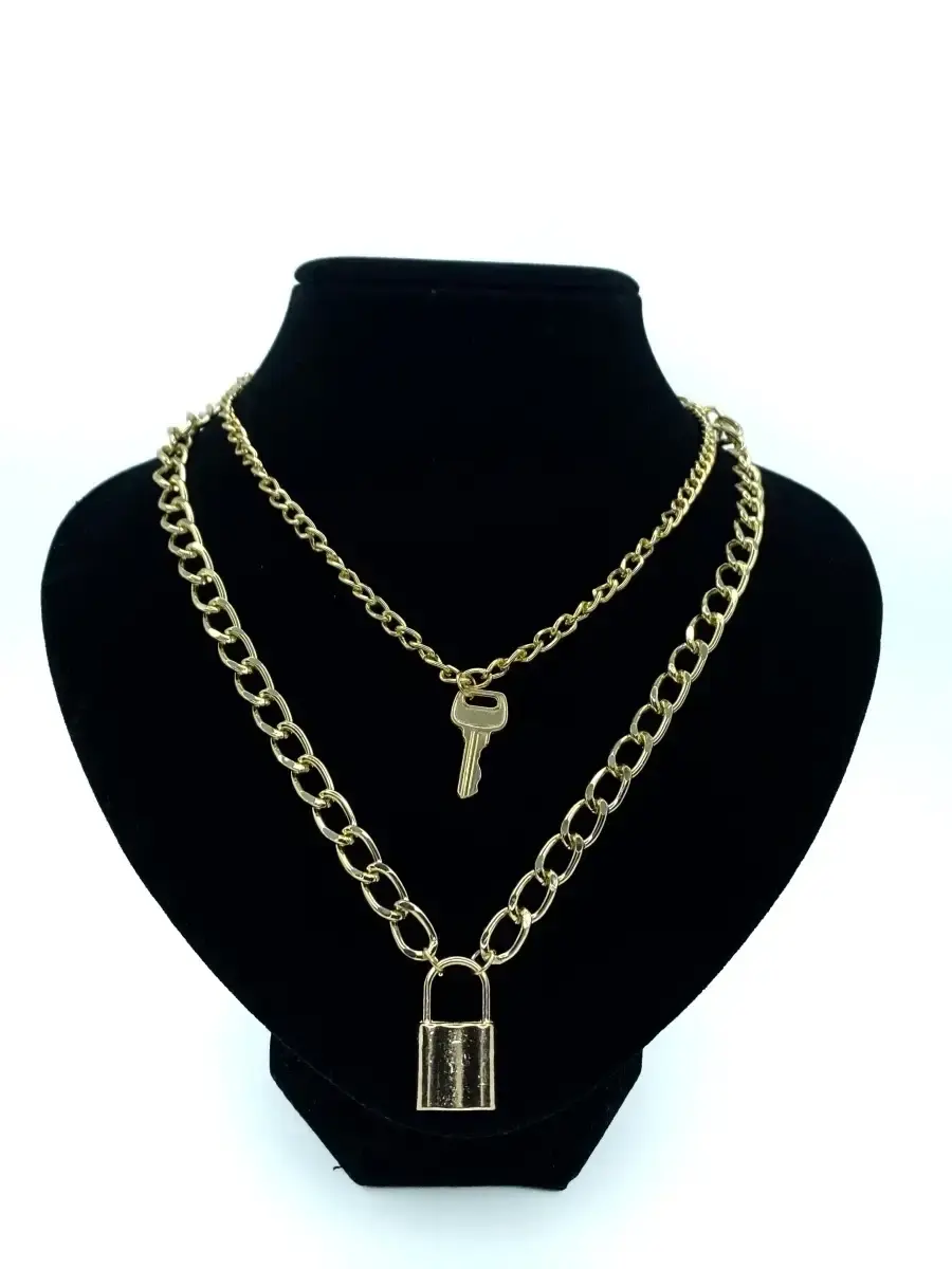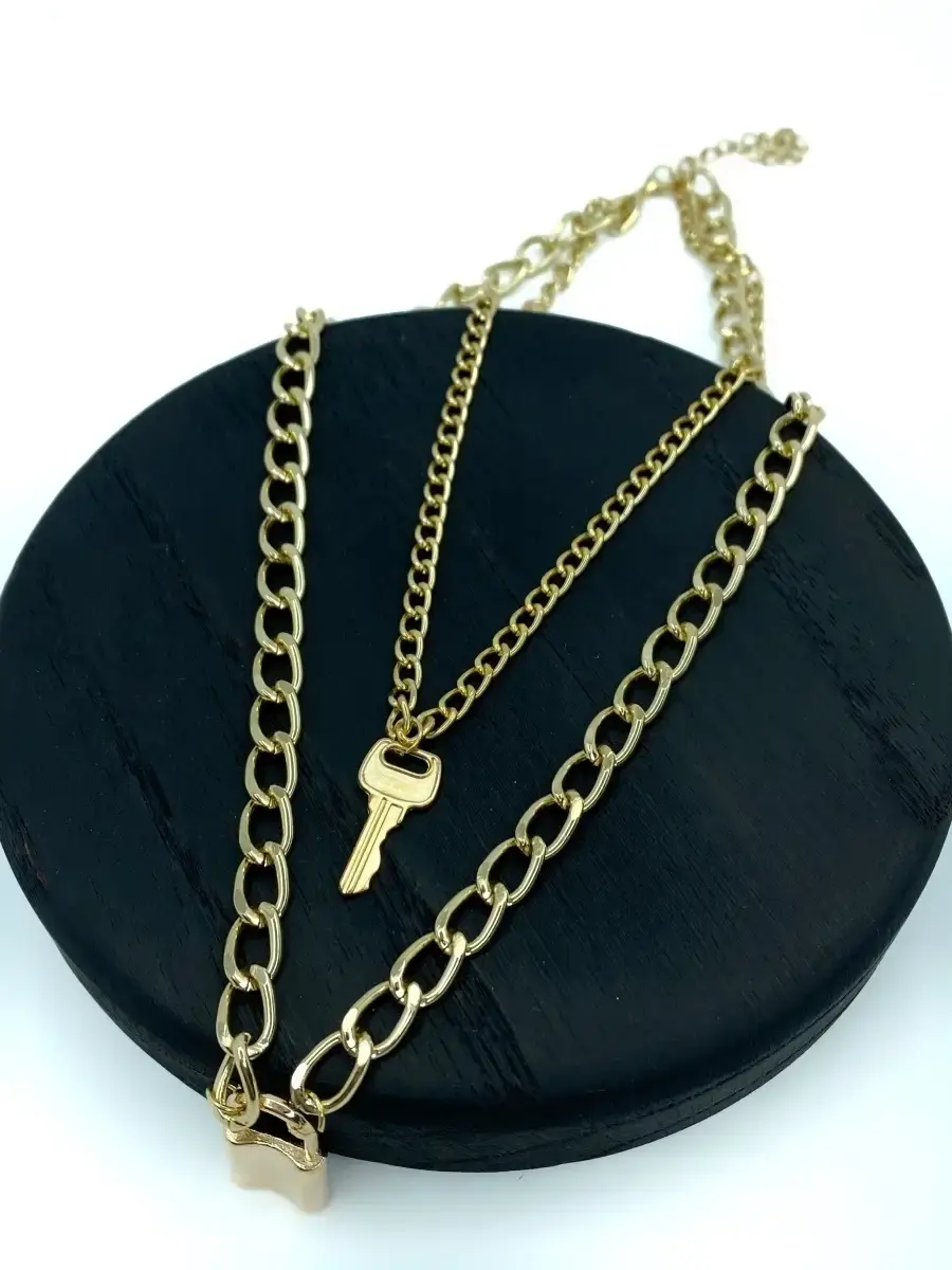 Массивная объемная золотистая женская цепь с кулонами ключ и замочек колье для девушек