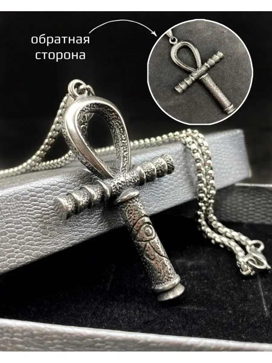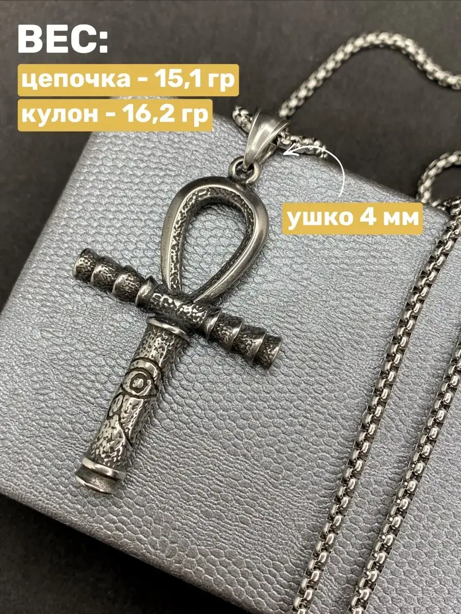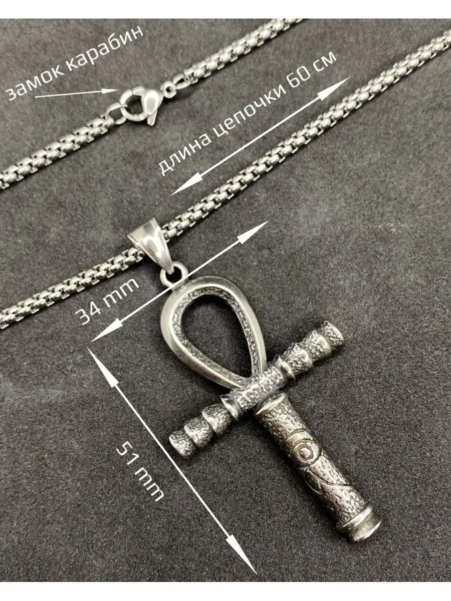 Длина египетского талисмана на шею в виде крестика 5 см. В комплекте с египетским украшением прилагается длинная серебристая бижутерная цепочка на шею из стали длиной 60 см. Стальная цепочка с кулоном подвеской сделаны из прочной нержавеющей хирургической стали 316L, которая не окисляется и не является причиной появления раздражений на коже. Бижутерное украшение из стали упаковано в подарочную коробку и станет идеальным подарком близкому человеку.