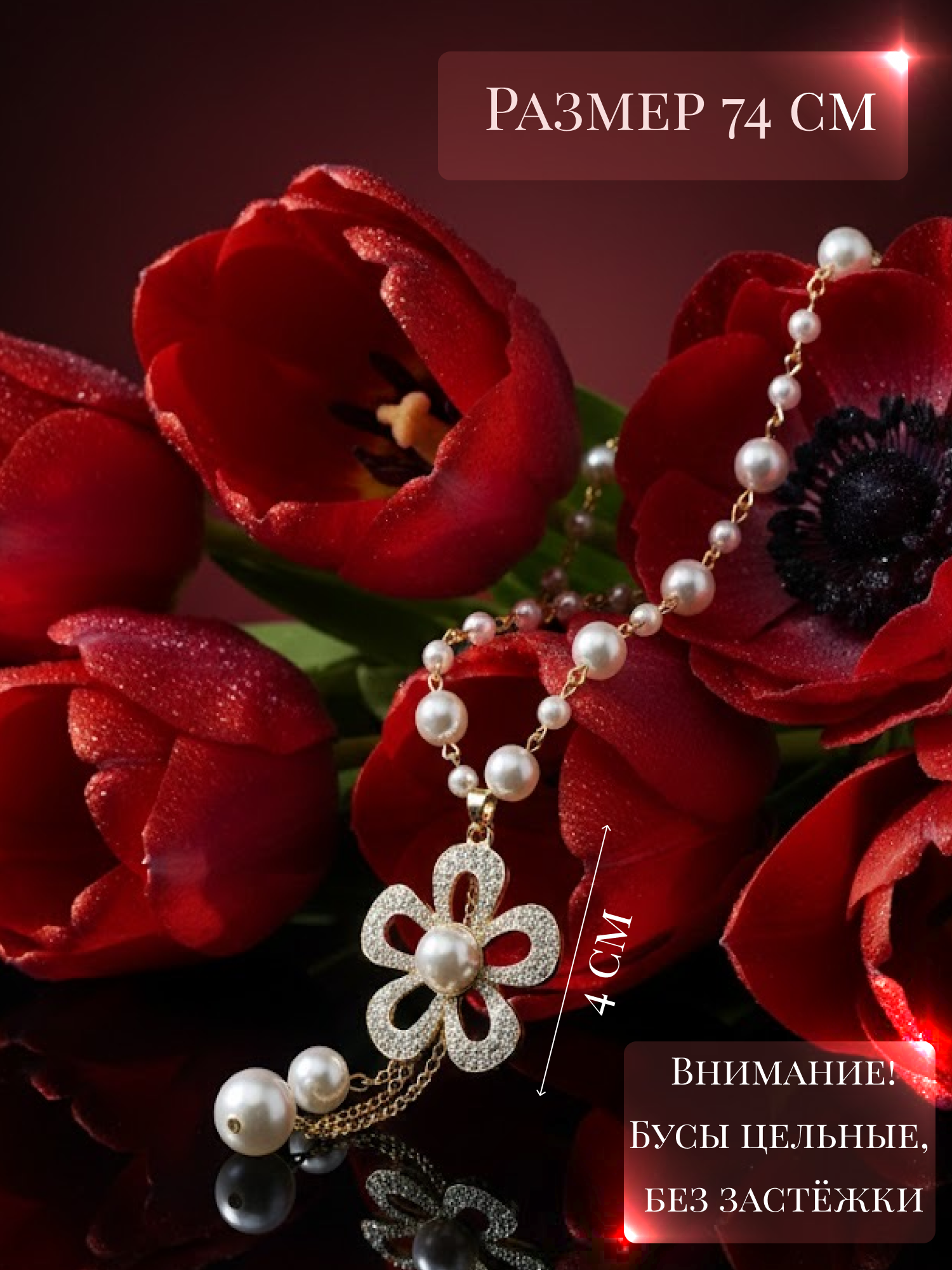 Это ожерелье — воплощение вечной классики и изящной женственности. Сочетание безупречного жемчужного низа длиной 74 см и нежной подвески в форме цветка, украшенной фианитами, создаёт аксессуар, который говорит об утончённом вкусе и внутренней гармонии своей обладательницы.