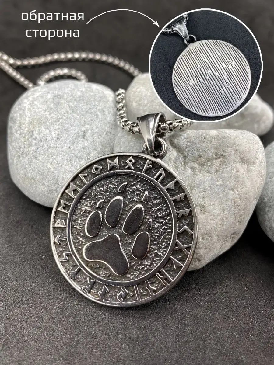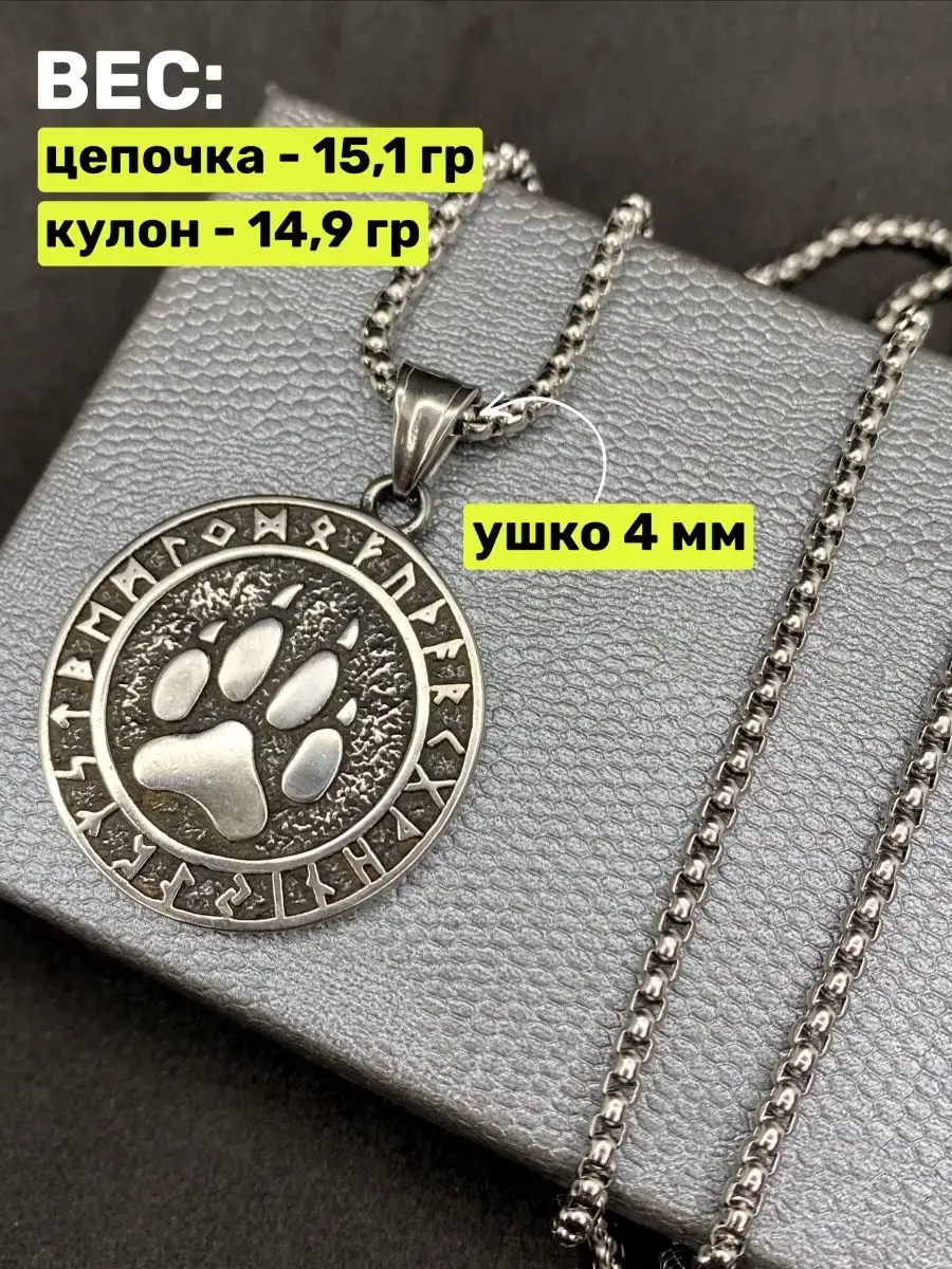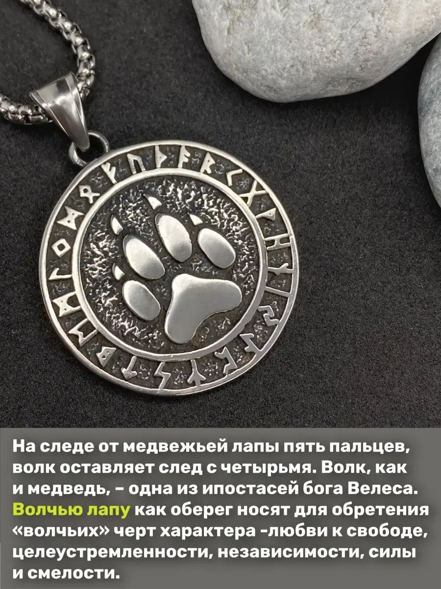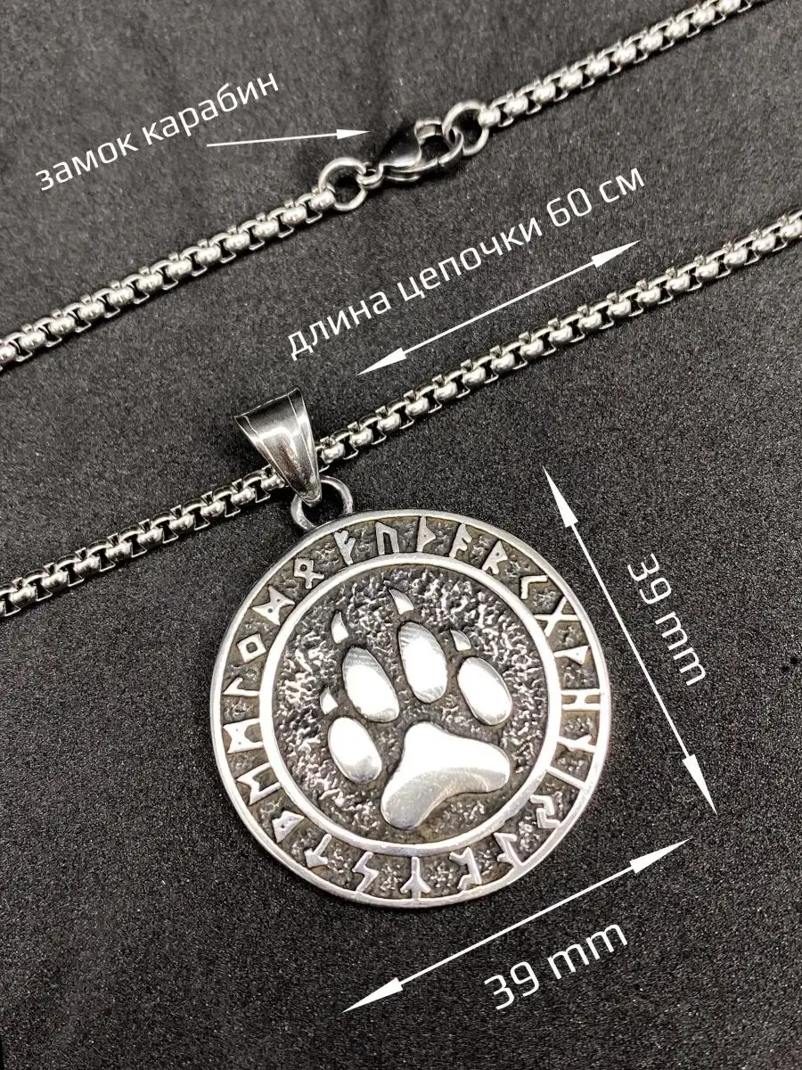 Длинная серебристая цепочка из стали со славянской подвеской кулоном Печать Велеса Волчья Лапа - идеальный вариант магического талисмана для начинающих бизнесменов и продавцов.