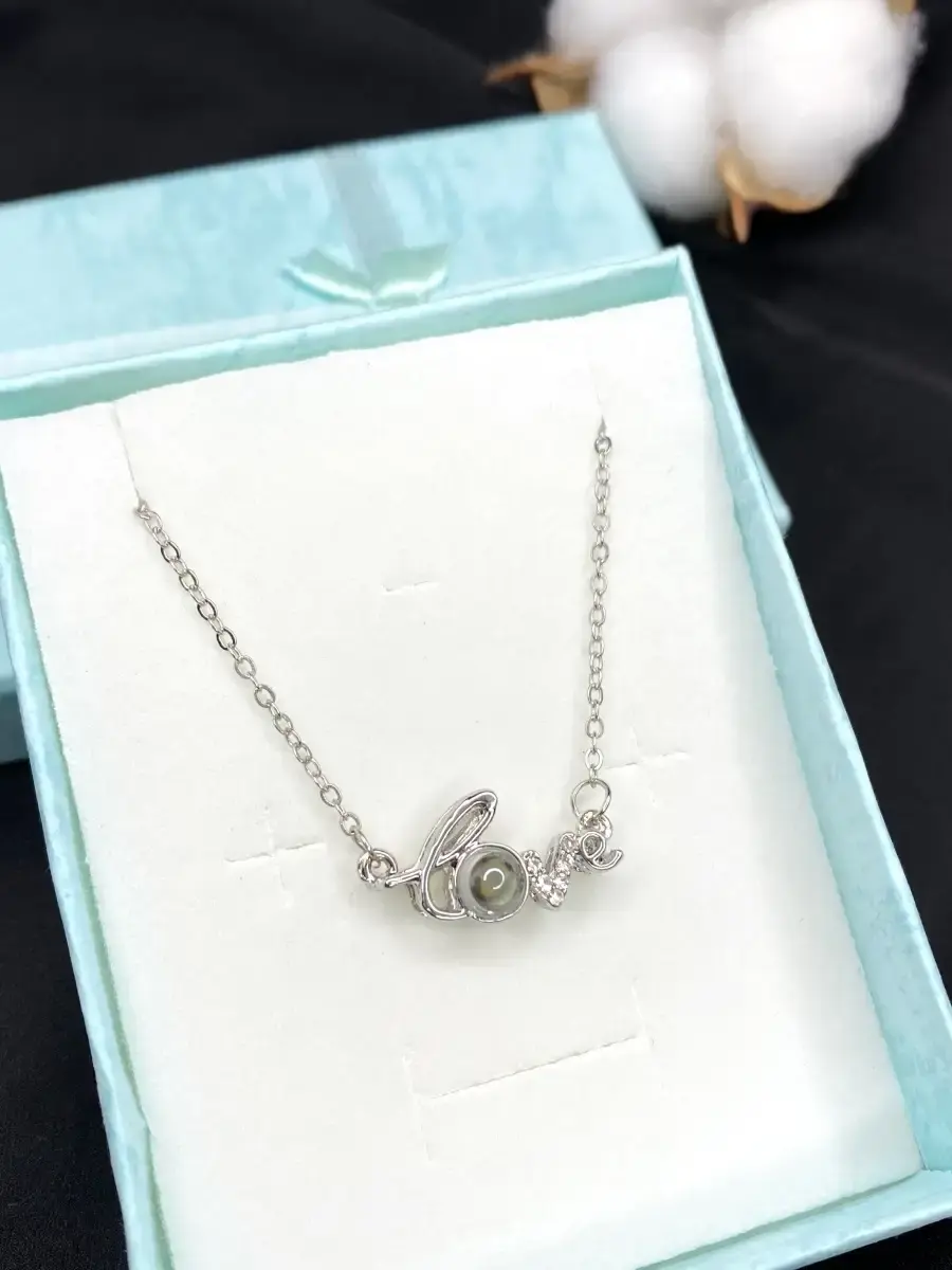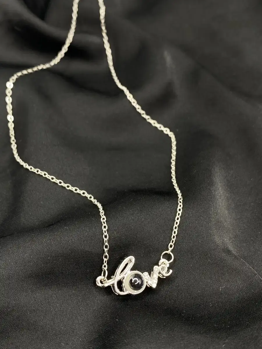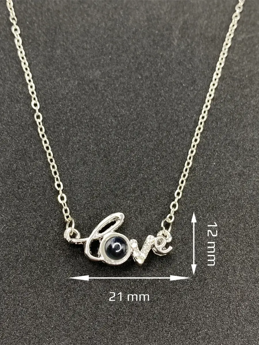 Легкая короткая серебристая женская цепь колье с подвеской LOVE и проекцией I Love You на 100 языка