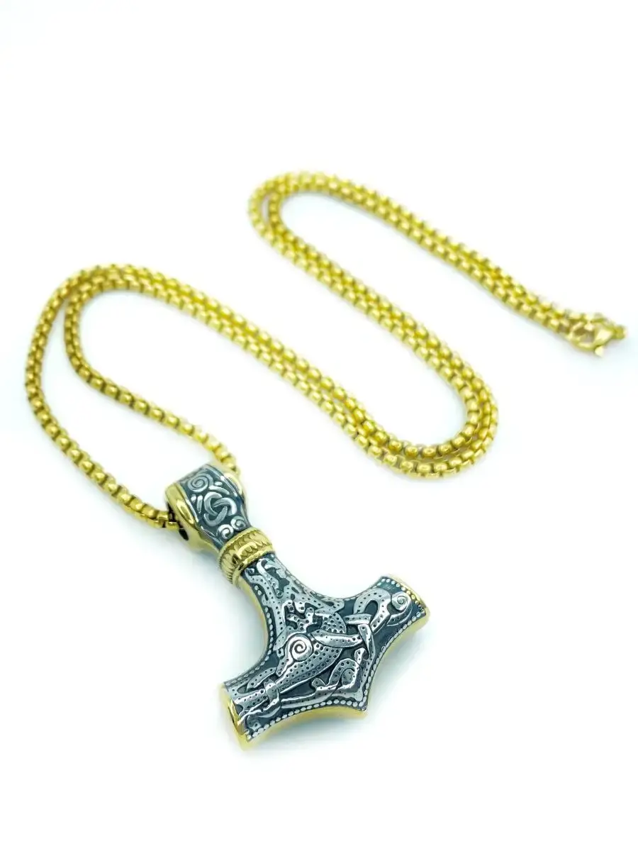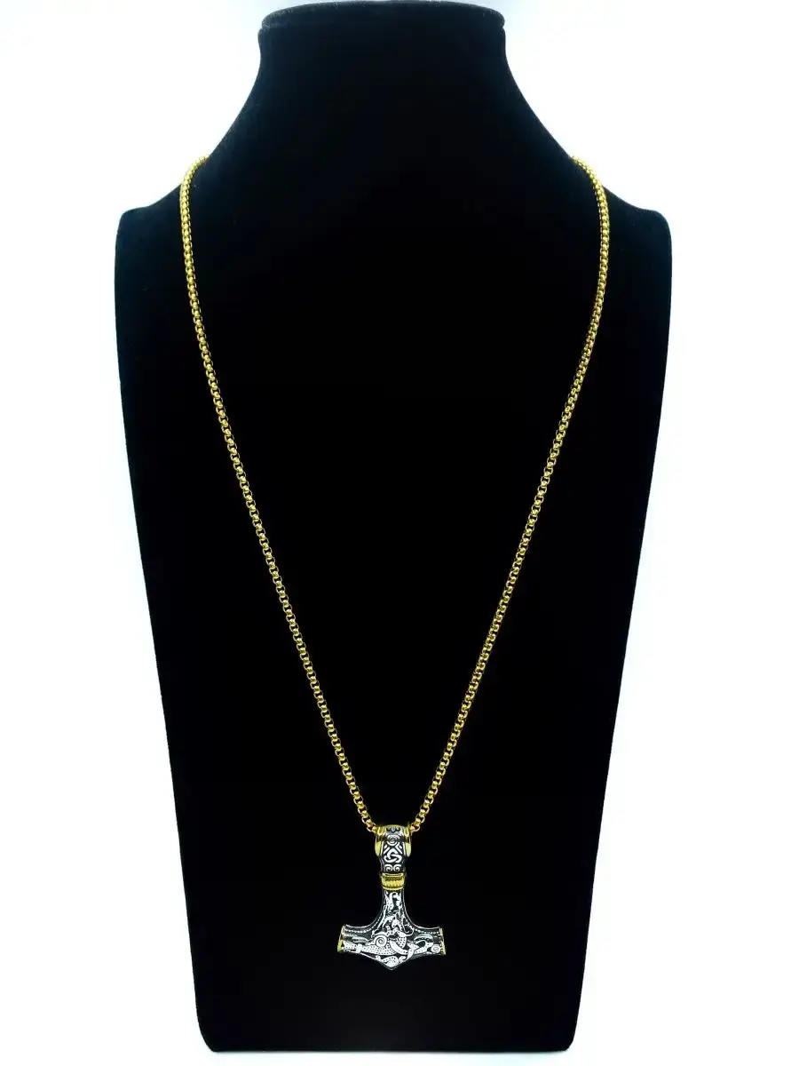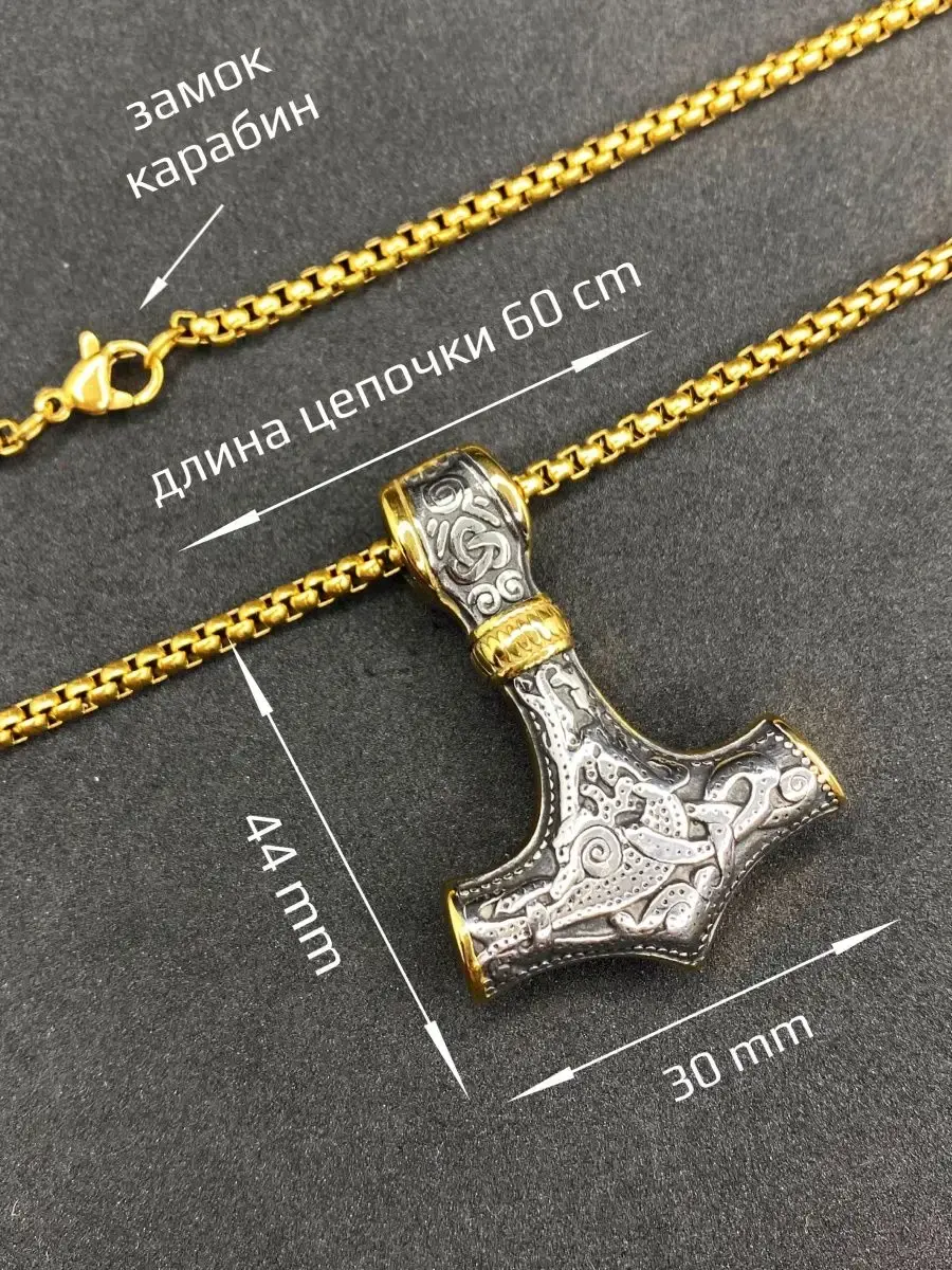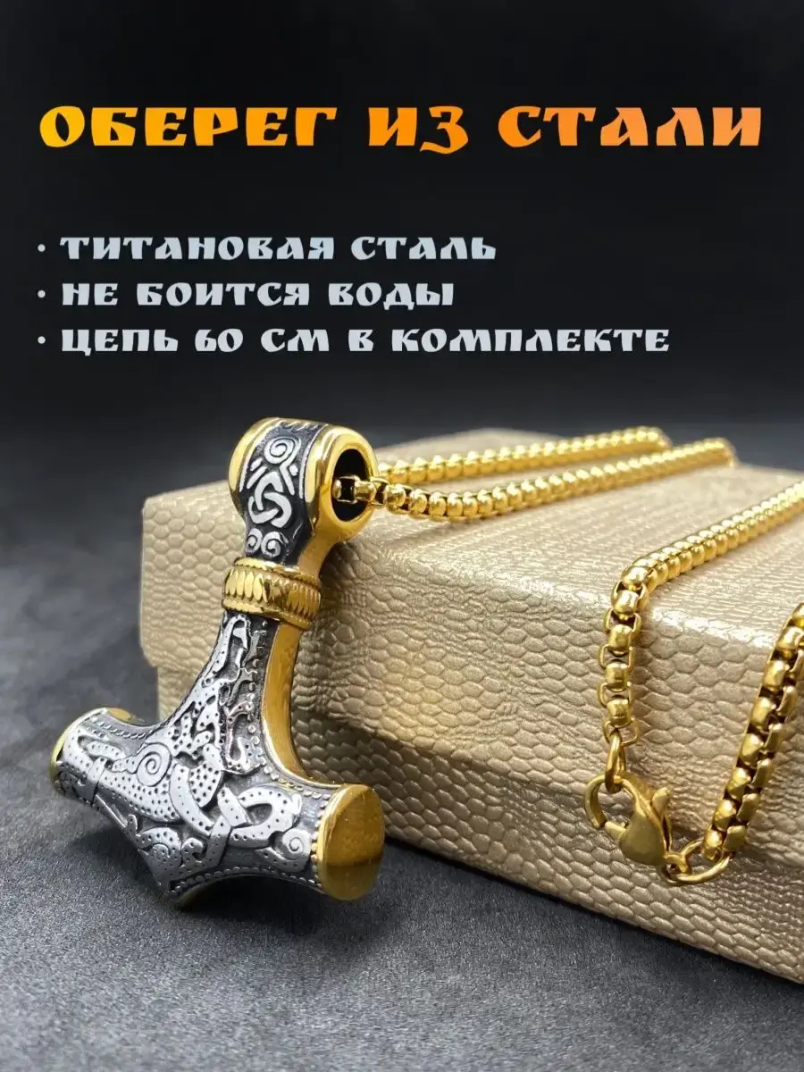 Золотистая стальная мужская цепь со скандинавским кулоном амулетом Гром Секира Тора из стали