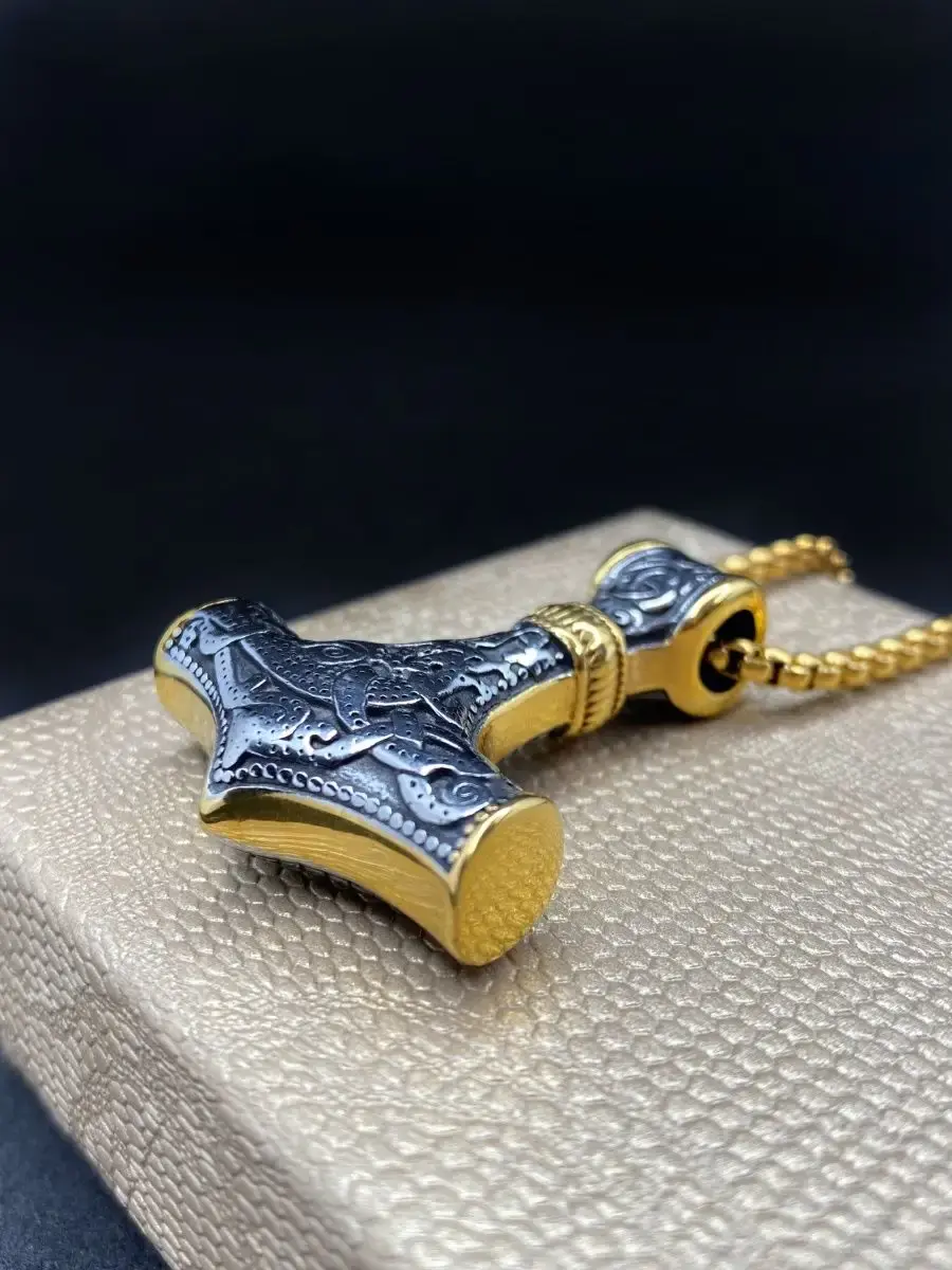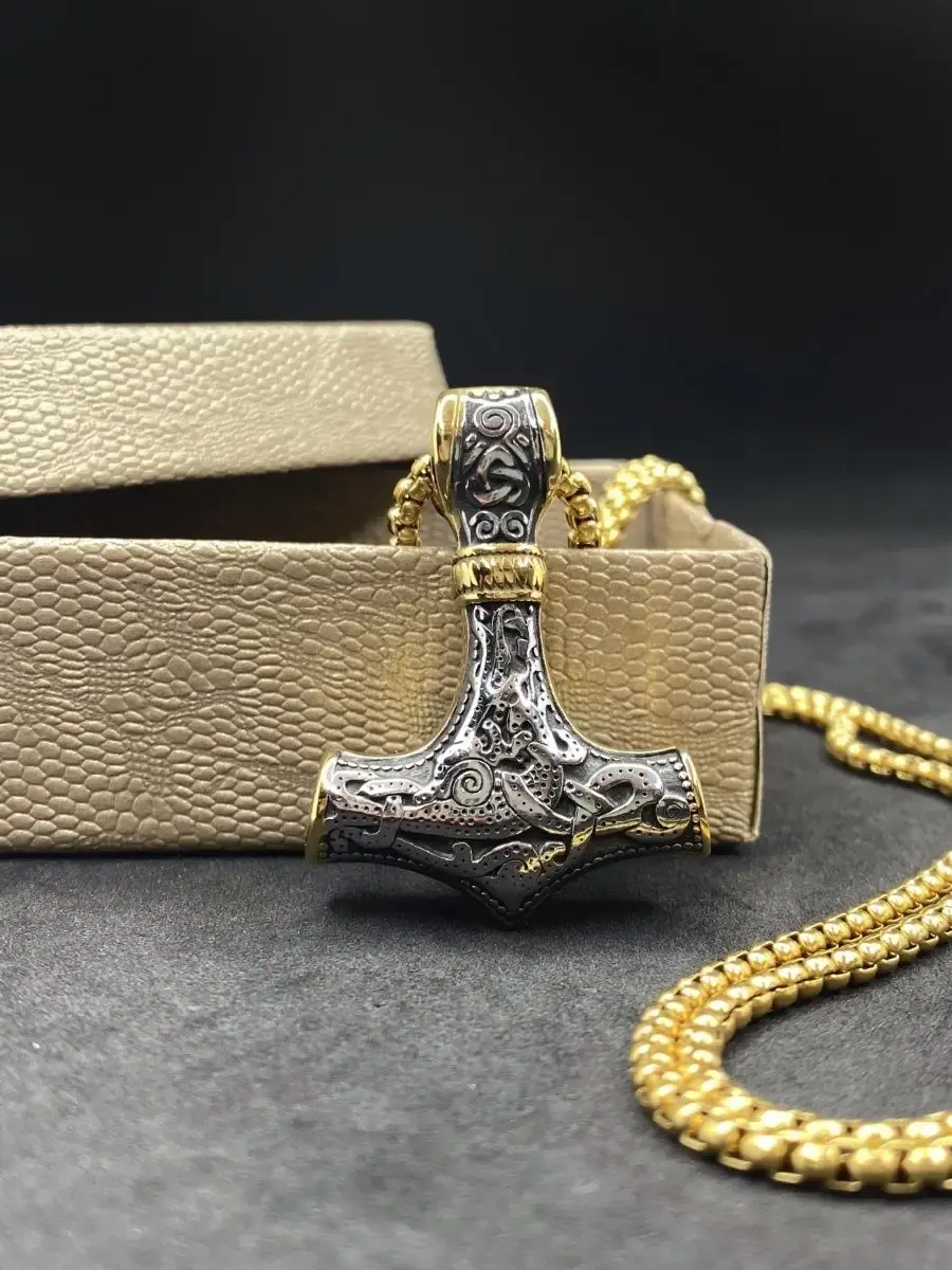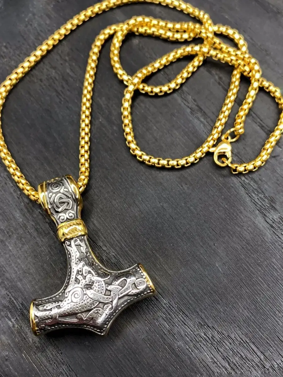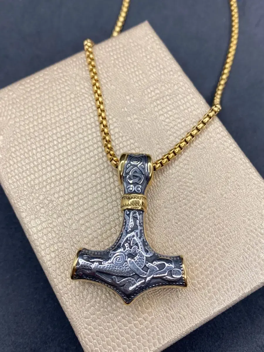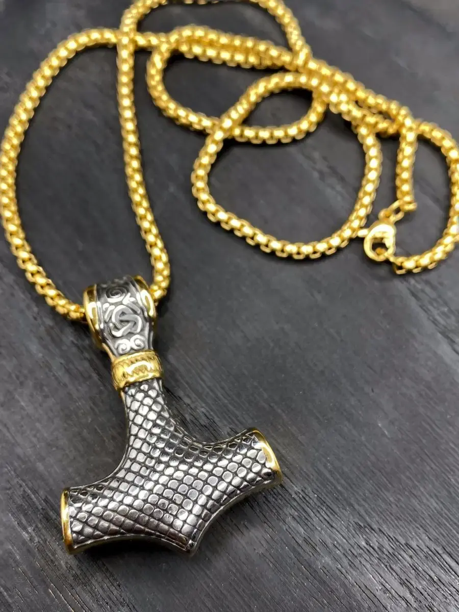 Золотистая стальная мужская цепь со скандинавским кулоном амулетом Гром Секира Тора из стали