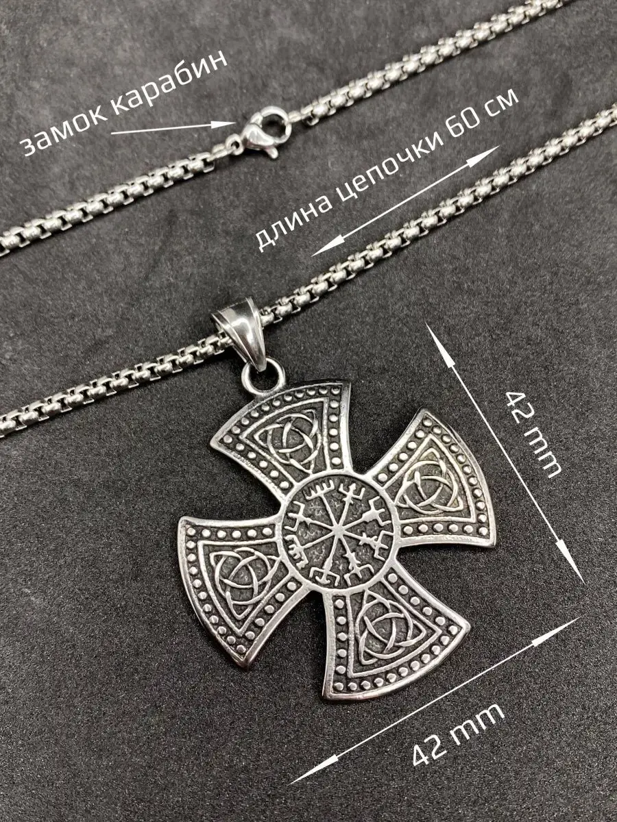 УНИСЕКС. Длинная стальная цепочка на шею с большим массивным кельтским крестом из стали и славяно-скандинавскими символами Вегвизир и Триглав - эффектный уникальный и символичный подарок для мужчин и женщин в красивой ПОДАРОЧНОЙ КОРОБКЕ!