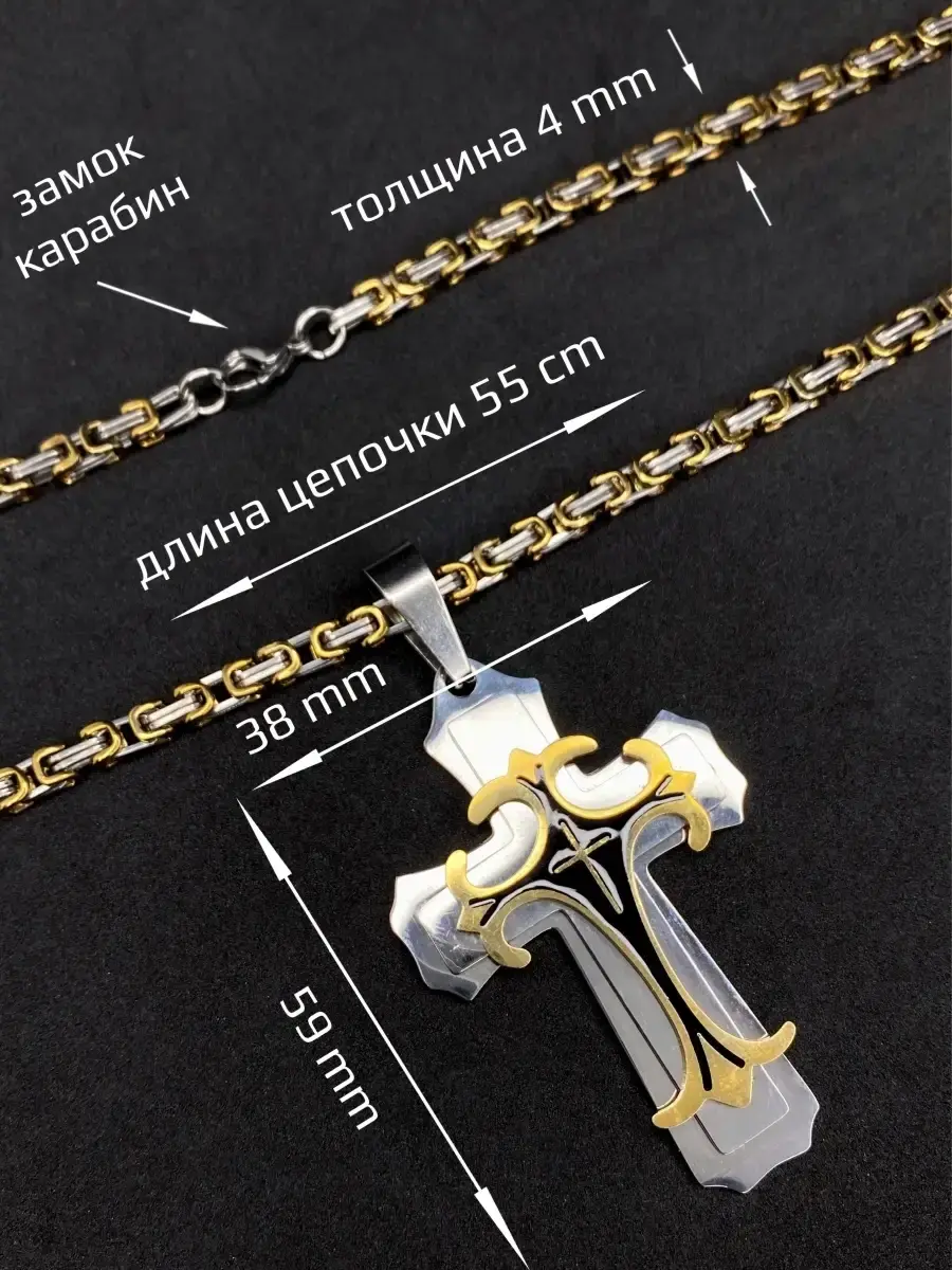 Длина цепочки для мужчин 55 см, ширина 4 мм, плетение Византия. Диаметр креста 5-6 см в зависимости от модели. Мужское украшение на шею сделано из ювелирной титановой стали, которая не окисляется и не является причиной появления раздражения на коже. При надлежащей эксплуатации мужской крест на цепочке прослужит много лет и будут выглядеть идеально. Цепочка толстого плетения с большим крестом доставляется в подарочной коробке и станет идеальным подарком близкому человеку! Порадуйте близких мужчин отличным подарком в виде мужской бижутерии!